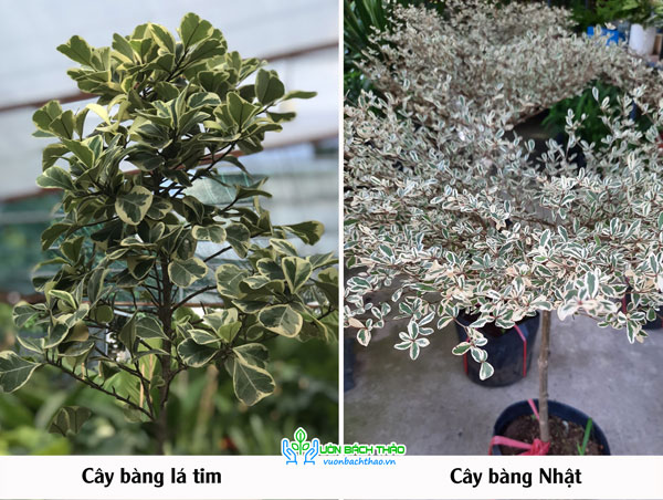 - Cách phân biệt hai loại bằng này là dựa vào màu màu sắc của lá. Lá cây bàng lá tim Đài Loan to hơn, hình trái tim, thường có màu xanh, viền cẩm thạch. Còn lá của cây bàng Nhật có màu xanh bóng, viền mép màu trắng kem giống cẩm thạch màu cẩm thạch.