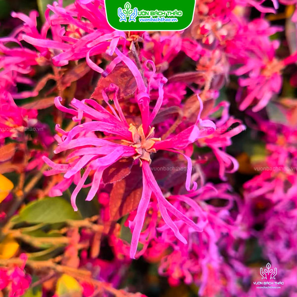 - Hoa non của cây thường nở theo chùm màu hồng sậm yêu kiều. Khi hoa nở lâu và già đi, sắc hoa sẽ biến chuyển pha thêm chút tím nhãn nhặn. Hoa có dạng tua rua với nhiều cánh dài mảnh, chừng 2 – 3cm, cùng hương thơm thoang thoảng, dễ chịu. Quả cây có màu nâu, chứa hạt bên trong.