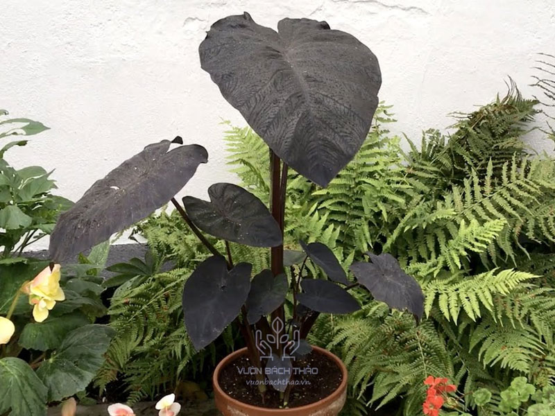 - Cây môn đen chủ yếu được trồng để có những tán lá to, đẹp, Colocasia esculenta ‘Black Magic’ à một loại cây lâu năm có củ, ưa sương giá với những chiếc lá màu tím khói có cuống dài, hình trái tim, dài tới 0.6 mét. So với các giống cây dòng Alocasia có lá hướng lên trời, lá của dòng Colocasia rủ xuống và hướng xuống đất.