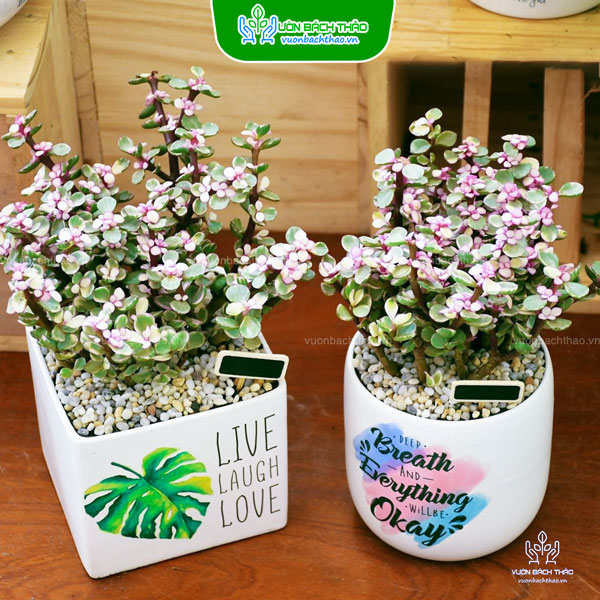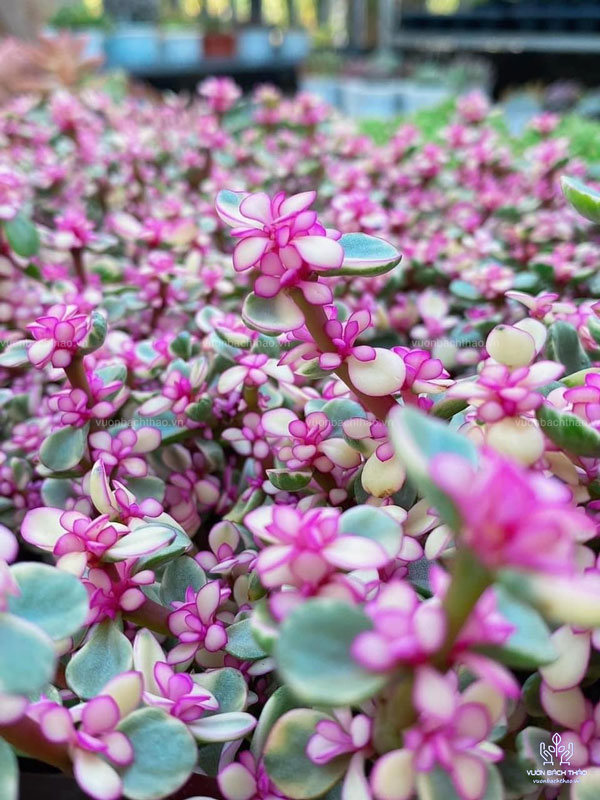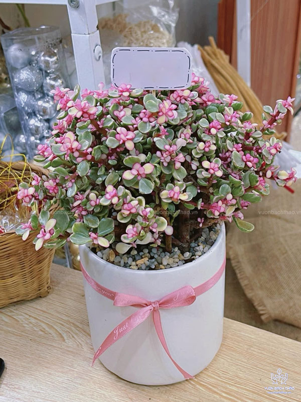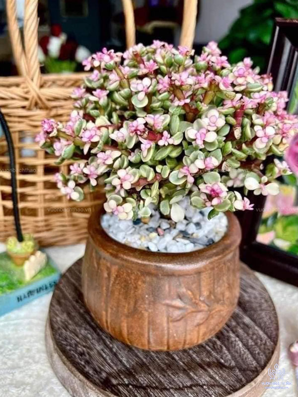 - Hoa màu hồng nhạt có 3-4 cánh, mọc ở ngọn cành. Cánh hoa trông như những chiếc lá mọng nước nhưng có màu hồng và có hình oval. Mỗi ngọn là 1 bông hoa hồng xen lẫn với màu xanh của lá, màu đỏ thẫm của thân tạo nên sự hài hòa màu sắc, là loại cây để bàn trang trí rất ấn tượng.