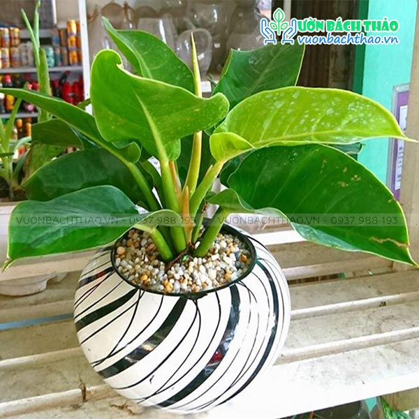Với cây được chăm sóc trong khoảng 5 đến 6 tháng sẽ cho chiều cao trung bình 30-35 cm, từ 6-8 lá, khi được vào chậu sứ, cây trầu bà đế vương có kích thước vừa phải để đặt trên kệ, bàn làm việc. Khi kết hợp giữa cây Trầu bà đế vương vàng và chậu cây đá mài giúp cho cây càng trở nên xinh đẹp, sang trọng.
