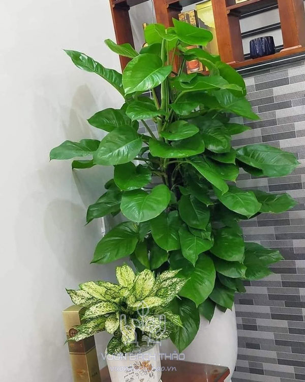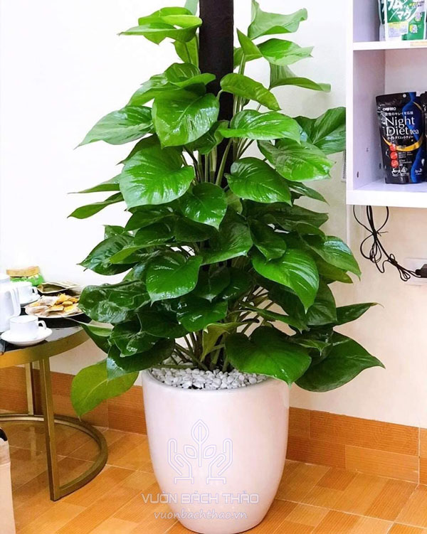- Đặt trong phòng khách: Cây trầu bà phù hợp để bày trong phòng khách. Màu xanh mướt, bóng mượt của cây Trầu Bà leo cột phối cùng các màu sáng sẽ tạo thành điểm nhấn cho phòng khách.