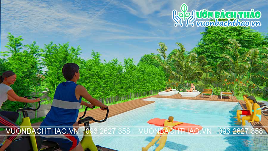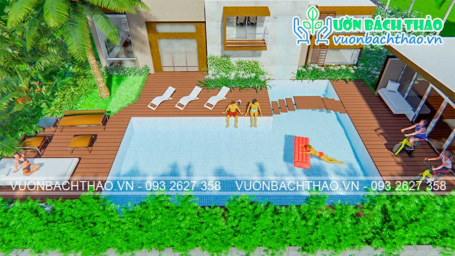 Là một người yêu thiên nhiên và muốn được thư giãn trong không gian xanh mát nên phong cách vườn nhiệt đới là lựa chọn ưu tiên của chị Hà. Lấy ngôi nhà làm trung tâm, cây cối trồng dần ra phía ngoài, tạo cho khu vườn 1 chiều không gian là chiều thẳng đứng. Song đó, sắc xanh của cây cối hòa hợp cùng màu xanh của hồ bơi tạo nên không gian đầy thơ mộng. Chính điều này giúp cả nhà chị Hà có thể chiêm ngưỡng được toàn bộ khu vườn xinh xắn ngay khi ngồi bên trong nhà.